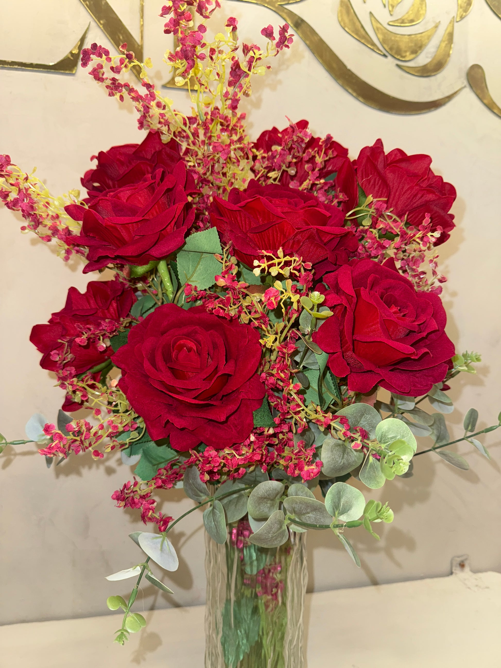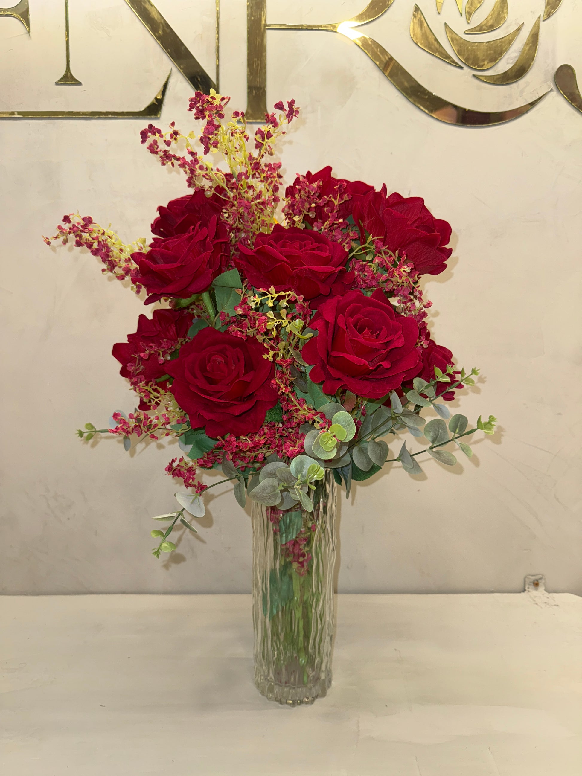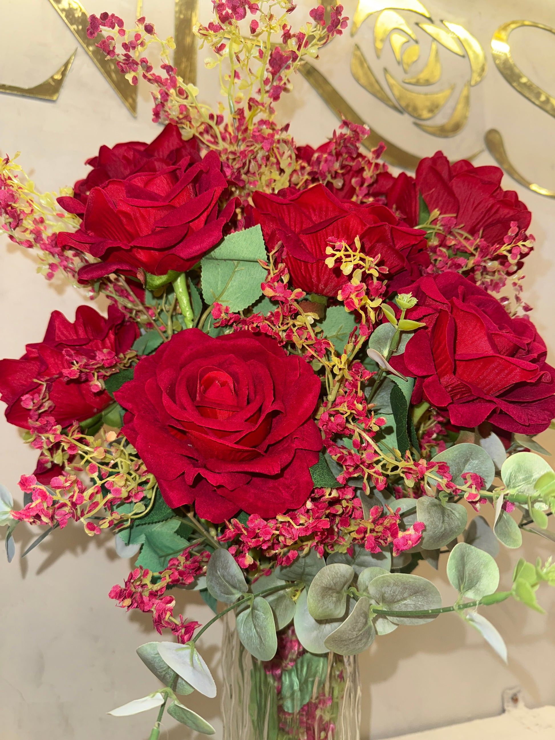 Um sofisticado arranjo de flores artificiais composto por dez rosas colombianas vermelhas, gypsophila vermelha e eucalipto, apresentado em um vaso de vidro elegante. Uma peça duradoura que transmite romantismo e requinte, perfeita para decorar ambientes com charme e elegância atemporal.